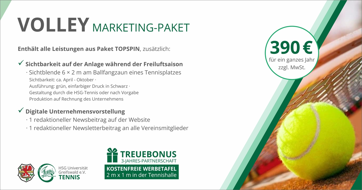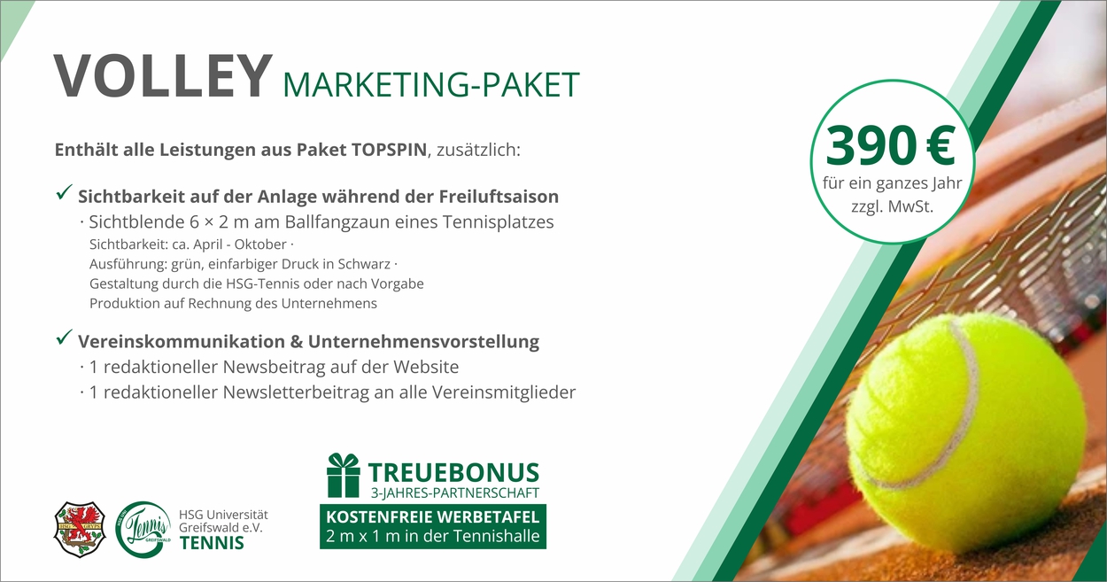 - Bei Abschluss einer 3-jährigen Partnerschaft im VOLLEY- oder MATCHBALL-Marketing-Paket erhalten Unternehmen zusätzlich eine kostenfreie Werbetafel in der Tennishalle.
