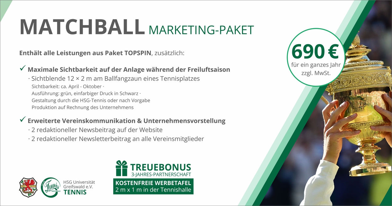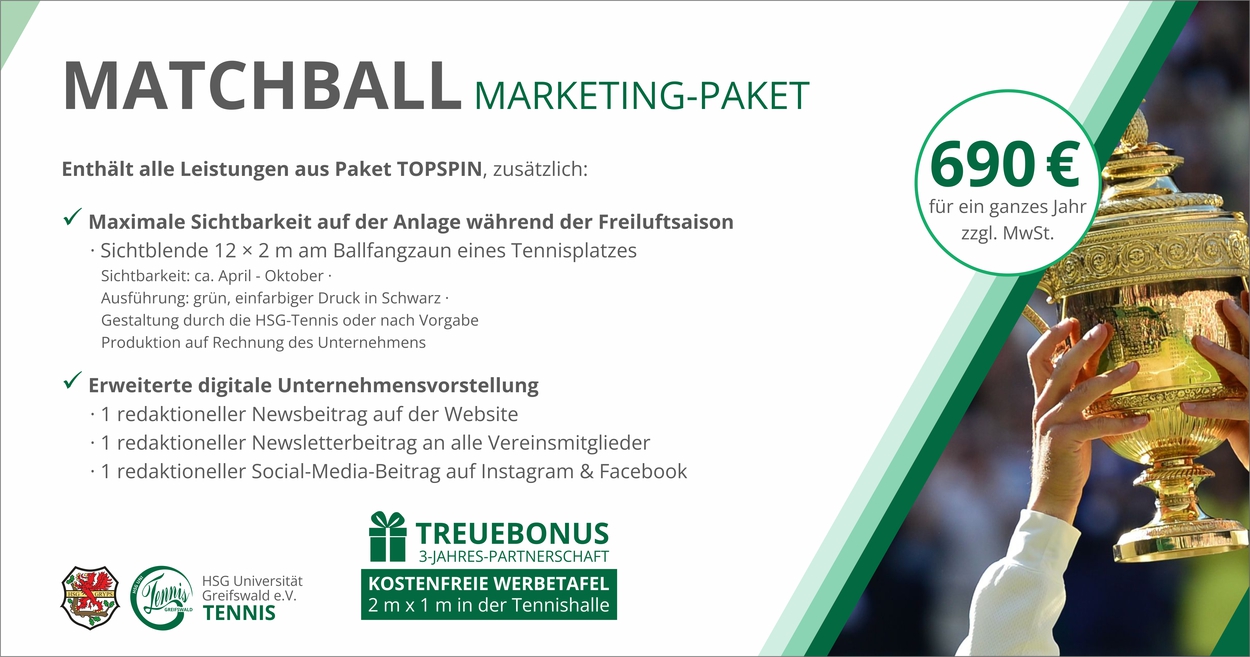 Mit unseren Marketing-Paketen bieten wir Unternehmen die Möglichkeit, sich sichtbar und partnerschaftlich bei der Tennisabteilung der HSG Universität Greifswald e. V. zu präsentieren.